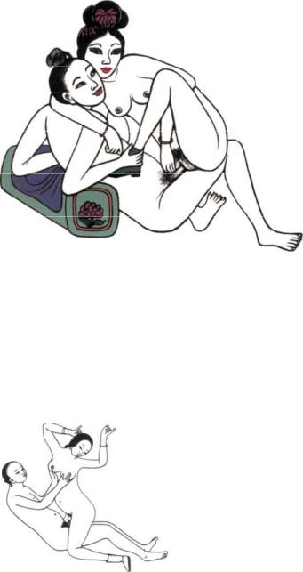 Woman the Initiatress of Love. Taking the active role, she confers her intuitive awareness and Wisdom-energy on her partner. From a Chinese hand-colored wood print of the Ming period.