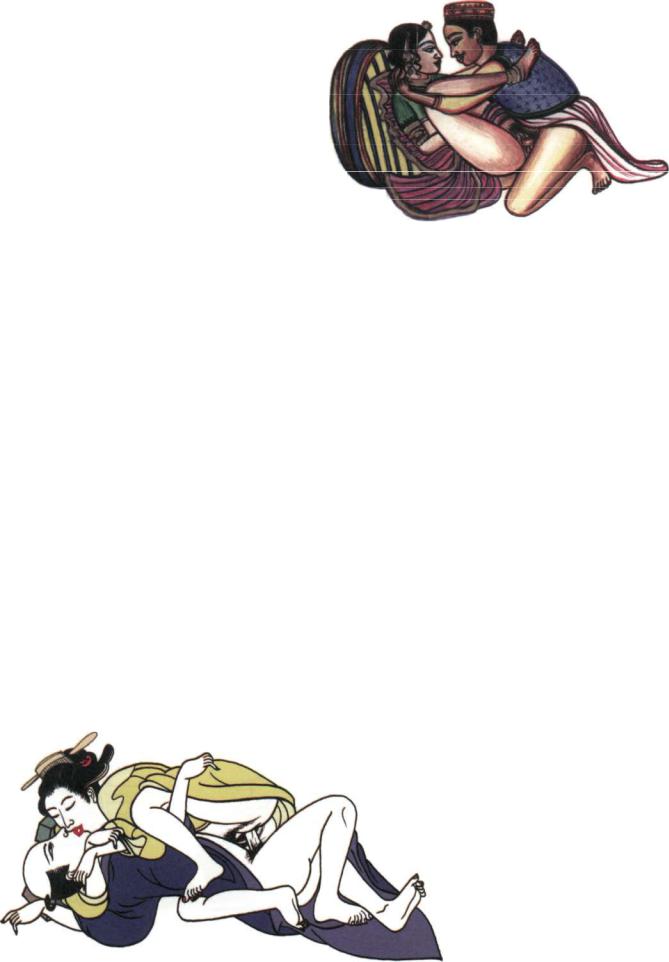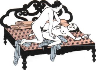 In this love-making posture the woman holds her left hand in a gesture used to channel sexual energy and prolong orgasm. From a Chinese painting of the eighteenth century.