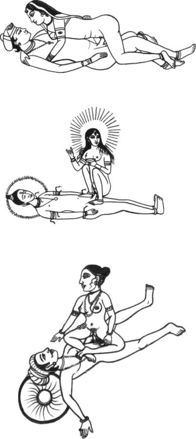 A woman whose passion has not been fully gratified should ask her man to lie on his back. Then, sitting cross-legged upon his thighs, she should seize his Lingam and insert it into her Yoni. Moving her waist up and down, lifting up and sinking down upon him, advancing and retiring, she should make love to him in this way.