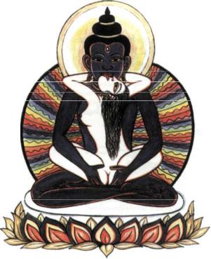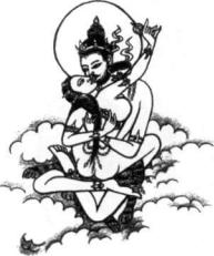 The Fulfillment Stage of Yoga involves the physical, emotional, and mental aspects of the Self; it is the full expression and joy of harmonious love-making. The experience is ecstatic, orgasmic, and totally satisfying. Tibetan teachings liken it to the moment of Genesis, created by our primordial ancestral spirits, the cosmic Father/Mother, in ecstatic union. The iconographical representation of this moment is a seated couple locked in sexual embrace, the male aspect colored dark blue and the female milky white.
