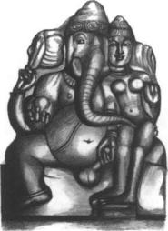 Ganesha with his consort Siddhi (representing supernormal power). This Tantric form of the Elephant Lord symbolizes the awakening of sexuality and spiritual ideals. From a stone carving, South India, circa fourteenth century.