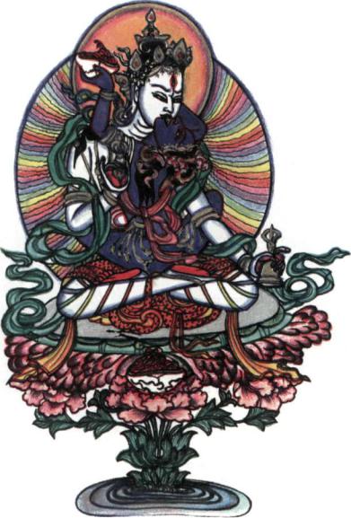 Padmasambhava, the Indian Tantric master who established Tantric Buddhism in Tibet in the eighth century, in ecstatic union with his consort. This mystic form celebrates the unity of celestial Voidness with terrestrial Wisdom. From a Tibetan painting of the nineteenth century.