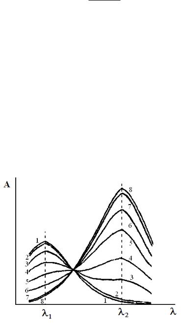 Например, для системы спектров, изображенной на рис. 15.1, степень диссоциации кислоты в растворе 5 можно рассчитать как по полосе поглощения при λ1, так и по полосе поглощения при λ2.