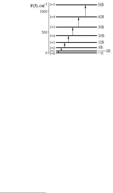 Термы первых восьми вращательных уровней на рис. 4.1 рассчитаны по уравнению (3.8) для молекулы в основном электронном состоянии с низшей энергией колебаний2. Стрелки указывают возможные переходы между уровнями при поглощении квантов.