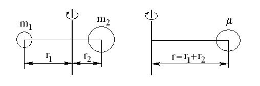 Рис. 3.1. Вращение гетероядерной двухатомной молекулы относительно оси, проходящей через центр масс (слева)