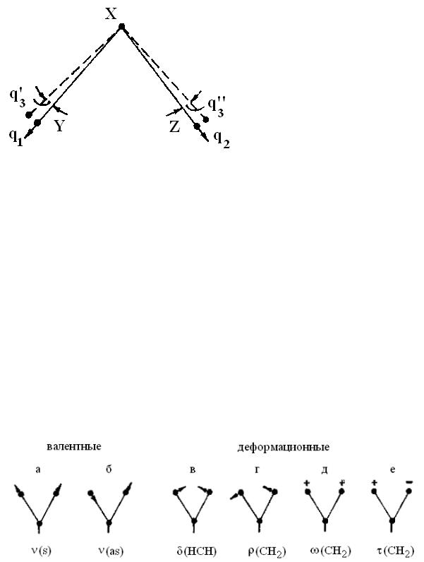 XY(q1) и XZ (q2), а третья – изменению утла между связями YXZ (q3). Таким образом, молекула XYZ имеет три нормальных колебания и, следовательно, три основных частоты колебаний.