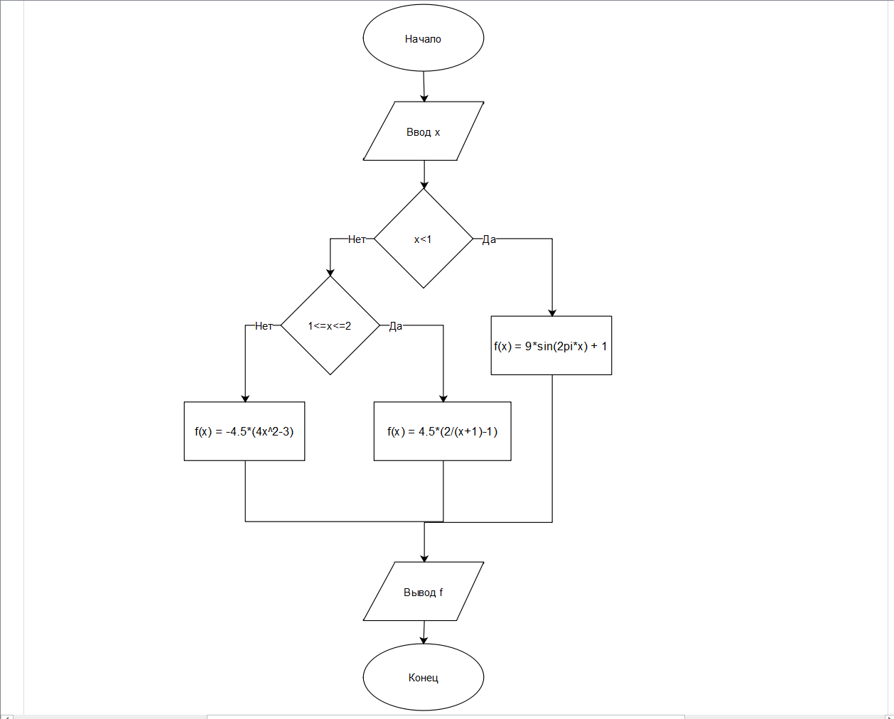 import math def VAR_2(x): if (x<1): print('Вычисление происходит по 1-ой формуле') f=9*math.sin(2*x*math.pi)+1 elif (x>=1) and (x<=2): print('Вычисление происходит по 2-ой формуле') f=4.5*(2/(x+1)-1) else: print('Вычисление происходит по 3-ей формуле') f=-4.5*(4*x**2-3) return(f) def TEST_VAR_2(): print('Введите x:', end=' ') x = float(input()) print('f =', VAR_2(x)) TEST_VAR_2() |