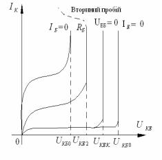 характеристиці з’являється ділянка з негативним диференційним опором (пунктирна крива на рисунку 8.2). Колекторний струм, при якому виникає вторинний пробій, зменшується зі збільшенням
