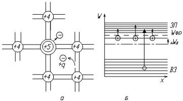 4-валентний НП (германій або кремній) 5-валентних атомів домішок (фосфор Р, сурма Sb, або миш як As), які називаються донорними домішками (лат. donar – той, що віддає). Схема кристалічної решітки з донорними домішками показана на рисунку 1.4а, відповідна енергетична діаграма – на рисунку 1.4б.