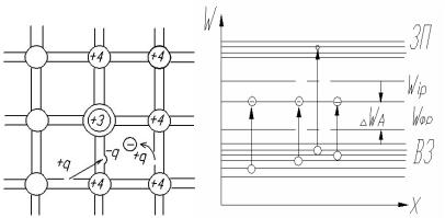 Під дією незначної енергії, яку називають енергією активації донорів WД (її величина невелика порівняно з шириною забороненої зони, як показано на енергетичній діаграмі, рисунок 1.4б), електрон стає вільним. Атоми домішок перетворюються на позитивні іони. Ці іони нерухомі, міцно зв язані з кристалічною решіткою і не беруть участі у створені електричного струму в НП. Завдяки малій енергії активації ( WД=0,16 еВ) для кремнію з домішками,WД=(0,01……0,13) еВ для германію з домішками навіть при кімнатній температурі відбувається повна іонізація 5-валентних атомів, яка супроводжується заповненням зони провідності вільними електронами (рисунок 1.4б). Вільні електрони у ЗП можуть з являтися і внаслідок дії механізму власної провідності, як у бездомішкових НП. Але ймовірність цього набагато нижча, ніж імовірність процесу активізації домішок. Тому у ЗП зосереджується набагато більше вільних електронів, ніж є дірок у ВЗ, оскільки іонізація донорного атома не супроводжується утворенням дірки.