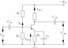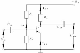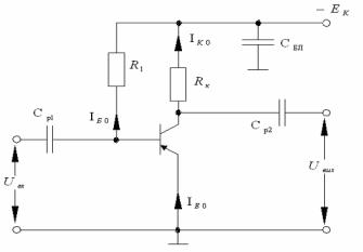 Схему зображено на рисунку 9.5. Зміщення ЕП у транзисторі цього каскаду здійснюється за рахунок струму бази спокою IБ0 , який