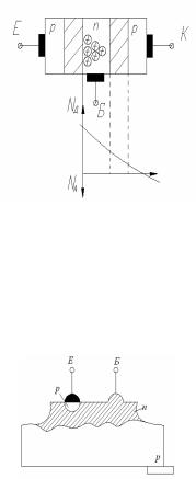Існують також дифузійно-сплавні транзистори, в яких області колектора і бази виготовляють шляхом дифузії домішок, а ЕП – вплавленням домішок. Розподіл концентрації донорів у базі таких транзисторів подібний до розподілу домішок у базі дрейфового транзистора. Різновидом таких транзисторів є меза - транзистор зі столоподібною структурою (рисунок 10.13).