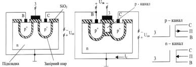 відділені одна від одної зустрічними p-n – переходами. Одна з цих областей є витоком, друга – стоком. Металева пластина, відділена від поверхні підкладки ізолювальним шаром двоокису кремнію, відіграє роль затвора.