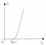 Для вимкнення тиристора необхідно відвести нерівноважні носії заряду з бази, з’єднаної з керувальним електродом. Анодний струм, що проходить через ще відкритий тиристор, постійно поповнює кількість нерівноважних носіїв заряду в базах. Тому значення струму керування (викликаного напругою на керувальному електроді зворотної полярності), яке необхідне для вимкнення тиристора, залежить від значення анодного струму через тиристор (рисунок 13.9).