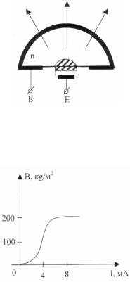 З метою підвищення ККД (зменшення відбиття) випромінююча поверхня виконується у формі напівсфери. Яскравість свічення майже лінійно залежить від струму через світлодіод (рисунок 14.2).