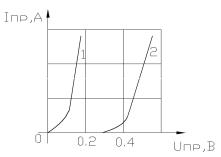 Рисунок 3.8 – ВАХ переходу Шотткі (1) та p-n-переходу (2)