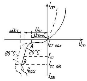 матеріалу, тобто від концентрації домішок. Точка В відповідає граничному режиму, в якому на стабілітроні розсіюється максимально допустима потужність.