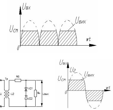 Форма вихідної напруги параметричного стабілізатора показана на рис. 4.6. Для стабілізації змінної напруги використовують два стабілітрони, які ввімкнені назустріч один одному (рис. 4.7 а). Форма його вихідної напруги показана на рис. 4.7,б.