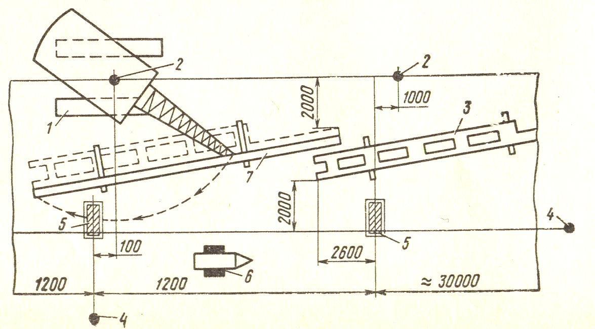 4 – стоянка теодолита; 5 – места установки колонн; 6 – тележка для приспособлений и инструмента; 7 – перекантованная колонна