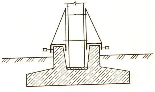 Устанавливаемые колонны одноэтажных промышленных зданий следует выверить до снятия с них стропов или захватов. Выверяют совпадение осей колонн с осями здания по рискам, нанесѐнным на фундамент и колонну. При необходимости колонну смещают специальными домкратами или чуть приподнимают краном над опорой и разворачивают до совмещения рисок. По окончании выверки и исправления положения колонн их временно закрепляют в проектное положение и снимают захват. Временное закрепление необходимо для придания устойчивости до окончательного закрепления и может быть осуществлено кондукторами различных типов, железобетонными или металлическими клиньями, забиваемыми в зазоры между стенкой стакана и колонной. При высоте колонны 12 – 18 м ее дополнительно раскрепляют тремя расчалками в плоскости их наименьшей жесткости. Колонны высотой более 18 м закрепляют 4 расчалками. Для тяжелых колонн кондуктор устанавливают, выверяют, закрепляют на фундаменте до начала монтажа колонны. Расчалки, кондукторы, клинья снимают только после заделки бетоном стыков колонн с фундаментами и набором бетоном 70% проектной прочности (рис.2.5).