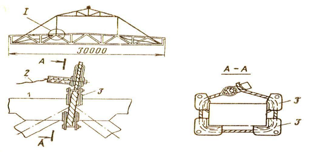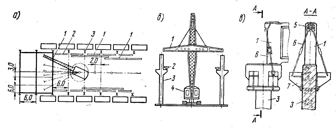 1 – стропильная балка; 2 – подкрановая балка; 3 – колонна; 4 – кран; 5 – захват; 6 – тяги со стяжной муфтой; 7 – кронштейн