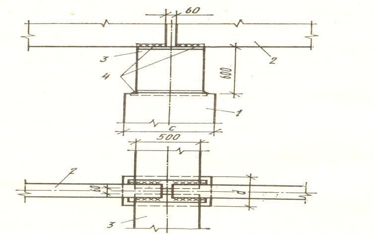 Рис.2.16. Опирание стропильной фермы на подстропильную ферму 1 – колонна; 2 – стропильная ферма; 3 – подстропильная ферма; 4 – электросварка высотой шва 12 мм