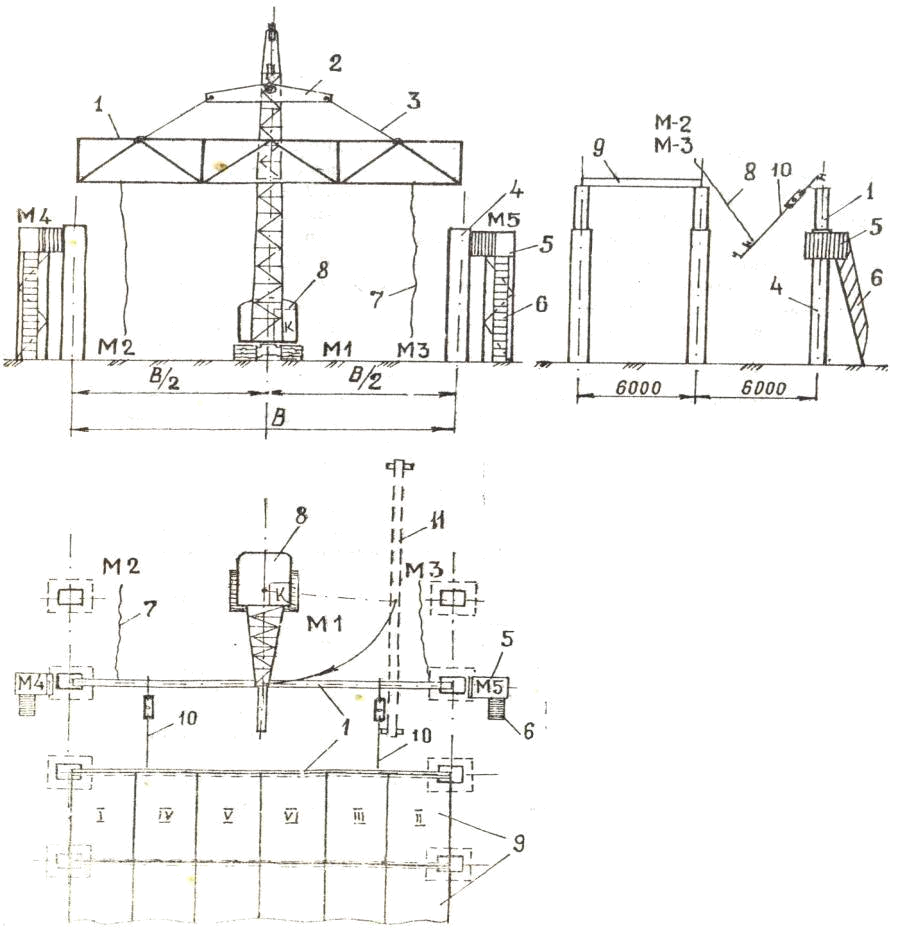 5 – монтажная площадка; 6 – приставная лестница; 7 – оттяжка; 8 – кран; 9 – плита покрытия; 10 – инвентарная распорка; 11 – стропильная ферма в кассете; М1; М2; М3; М4; М5 – расположение монтажников