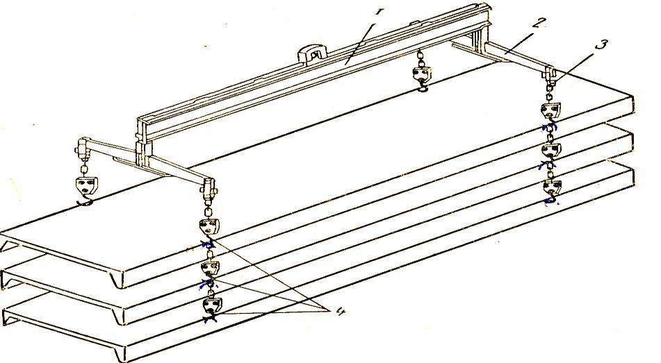 Рис.2.17. Траверса для монтажа плит покрытия 1 – траверса; 2 – коромысло; 3 – подвеска; 4 – крюки