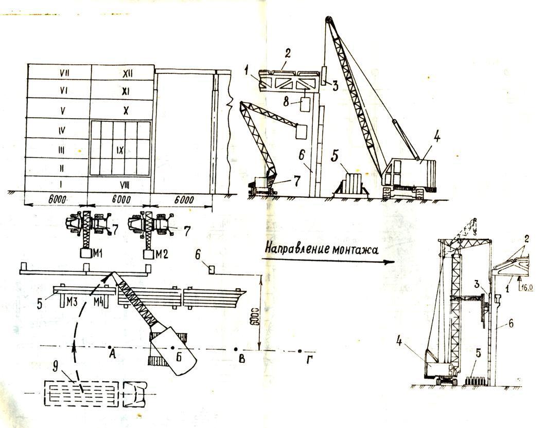 4 – кран; 5 – склад стеновых панелей; 6 колонна; 7 – самоходная вышка; 8 –
