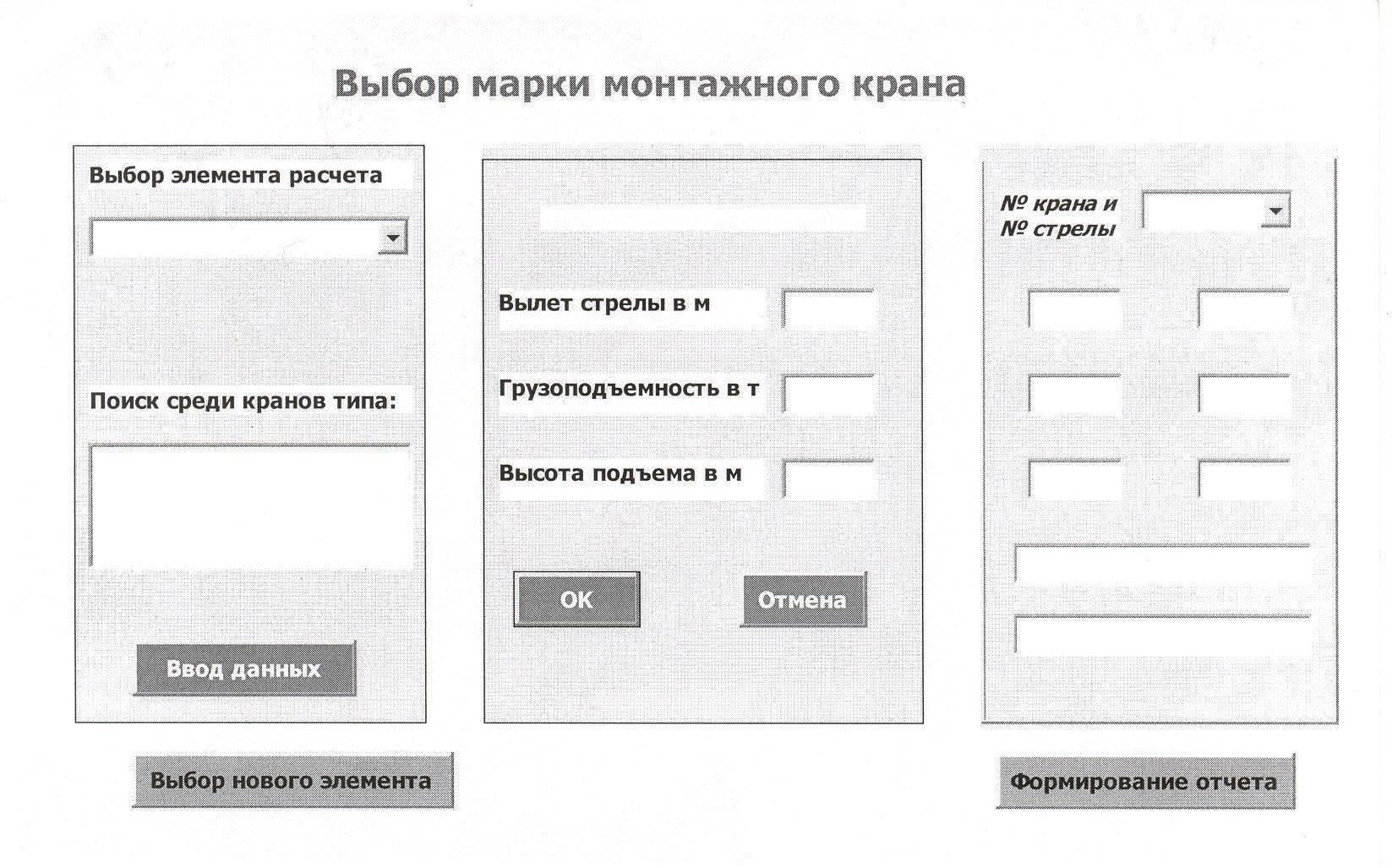 среднее подокна, указывая тип элемента и среди каких типов кранов вести поиск. После ввода технических параметров для выбранного элемента нажатие клавиши «ОК» дает компьютеру команду на поиск подходящих кранов. Для ввода данных следующего элемента нужно нажать клавишу «Выбор нового элемента». После ввода технических параметров всех элементов здания нажать кнопку «Формирование отчета».