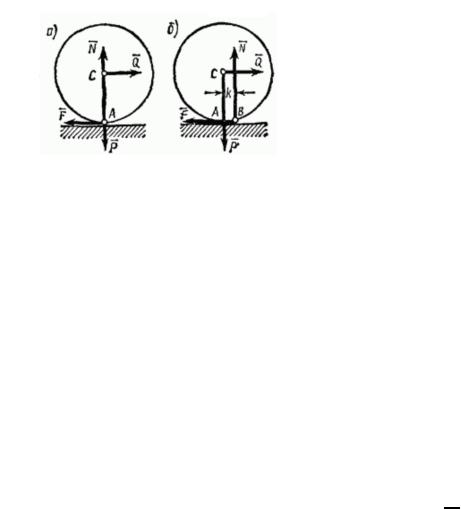 Рассмотрим круглый цилиндрический каток радиуса JR и веса JP, лежащий на горизонтальной шероховатой плоскости. Приложим к оси катка силу JQ (рис. а), меньшую JFпр. Тогда в