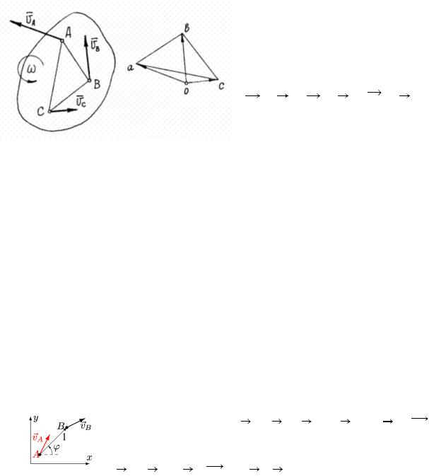 Пусть известны скорости нескольких точек плоского сечения тела. Если эти скорости отложить в масштабе из некоторой точки О и соединить их концы прямыми, то получится картинка, которая называется планом скоростей. (На рисунке