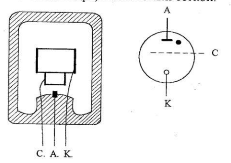 Катод представляет собой полый никелевый цилиндр диаметром 8 мм и длиной 6 мм, внутренняя поверхность которого активизирована цезием для снижения напряжения зажигания и горения. У нижней кромки катода установлена сетка в виде короткого цилиндра длиной 5 мм, верхняя часть которого углублена внутрь катода на 1-1,5 мм. Анод в виде молибденового стержня диаметром 0,6 мм заварен в стеклянный чехол, открытым остается только торец, который и является рабочей поверхностью анода. Электроды заключены в стеклянный баллон, наполненный неоном при давлении 19мм.рт.столба.