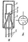 а - строение тиратрона МТХ-90; б - условное обозначение на схемах. катод 1 в форме закрытого сверху цилиндра; сетка С в виде шайбы с отверстием в центре и анод 2 - заостренный стержень, проходящий сквозь отверстие в шайбе. Выводами 5 от электродов является тонкие гибкие проводники.