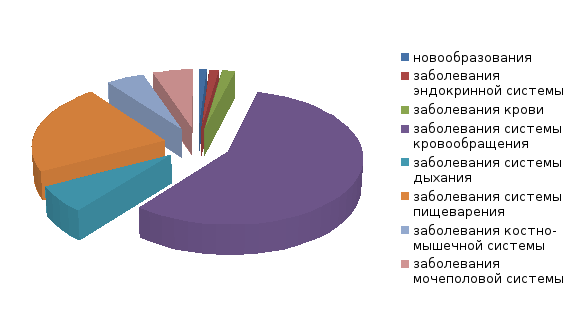 Анализ: из данных табл.5 и диаграммы 5 мы видим, что наибольший процент приходится на заболевания системы кровообращения, что связано с высоким развитием хронизации заболеваний и указывает на недостаточный уровень первичной и вторичной профилактики.