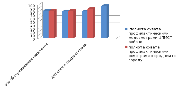 Анализ: из данных табл.2 и диаграммы 2 мы видим, что полнота охвата профилактическими медосмотрами населения, обслуживаемого ЦПМСП района Солнечный составляет 82,3 % и это на 1,6 % больше, чем городской показатель. Данные показатели свидетельствуют о том, что профилактические осмотры в районе Солнечный организованы лучше, чем в городе, но все равно находятся на низком уровне, так как план не выполнен в полном объеме.