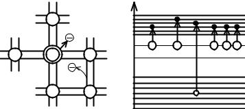 Цей тип провідності здійснюється завдяки введенню у 4- валентний НП (германій або кремній) 5-валентних атомів домішок (фосфор Р, сурма Sb або миш як As), які називаються донорними домішками (лат. donоr – той, що віддає). Схема кристалічної ґратки з донорними домішками показана на рисунку 1.4 а, відповідна енергетична діаграма – на рисунку 1.4 б.