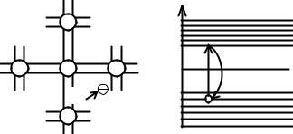 При збільшенні температури ( T 0 ) деякі валентні електрони отримують енергію, якої вистачає, щоб розірвати ковалентний зв’язок (рис. 1.3 а). Внаслідок цього у міжатомному зв’язку виникає одиничний заряд – дірка. На енергетичній діаграмі НП це явище супроводжується виникненням вільного енергетичного рівня (рис. 1.3 б).