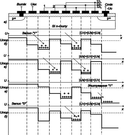 в) перенесення пакета дірок до наступних потенціальних ям при зміні потенціалів на електродах затвора; г) зчитування логічної одиниці на виході приладу під час екстракції дірок з потенціальної ями в р+ - область стоку; д) запис логічного нуля за відсутності негативного потенціалу на електроді затвора