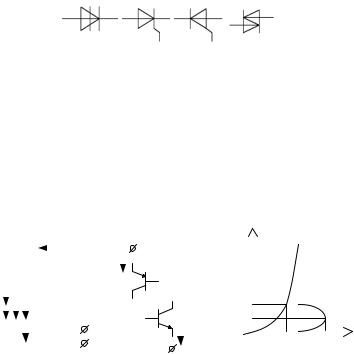 Умовні позначення тиристорів на схемах наведено на рис. 5.1. З точки зору застосування тиристор – це напівпровідниковий ключ, тобто прилад, основне призначення якого полягає в замиканні та розмиканні кола навантаження під дією зовнішніх сигналів.