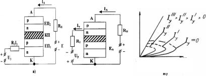кових зарядів у базах структури відбуватиметься швидше, ніж у випадку диністора, тому що джерело напруги керування у колі будь-якої з баз прискорює інжекцію через відповідний ЕП.