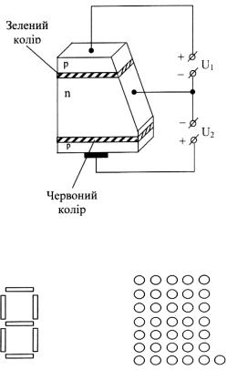 Використовуються світлодіоди з перестроюваним кольором свічення (рис. 6.3), які мають два p-n – переходи,