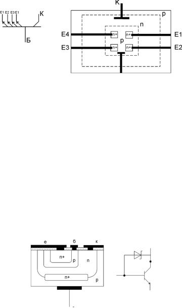 Чотирьохемітерні біполярні транзистори з об'єднаними колекторами і базами – це сукупність чотирьох незалежних транзисторних структур (оскільки взаємодія електродів через електрично нейтральну базу практично відсутня). До кожного емітера багатоемітерного транзистора E1 , E2 , E3 ,