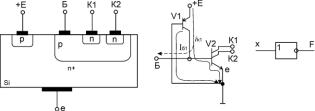 Елемент являє собою структуру, що складається з двох фізично об'єднаних транзисторів: горизонтального p-n-p і вертикального n-p-n. Емітерна область p-n-p транзистора називається інжектором і підкладається до позитивного полюса джерела живлення (+Е). Від одного інжектора можуть живитися декілька схем. Вертикальний n-p-n транзистор має кілька колекторів, які служать вихідними виводами логічного елемента. Особливості конструкції: спільна область n – типу є водночас базою p-n-p транзистора та емітером n-p-n транзистора і підключається до корпуса; спільна область p – типу служить колектором p-n-p транзистора і базою n-p-n транзистора. За такої фізичної структури не потрібна ізоляція між окремими елементами І²Л, оскільки вони мають спільну n – область. Через це досягається висока щільність упакування (10000 елементів на кристалі). Весь елемент займає площу, що дорівнює площі одного багатоемітерного транзистора. Зображений на рис. 7.22 типовий елемент І²Л – це логічний елемент НІ (ключ – інвертор).