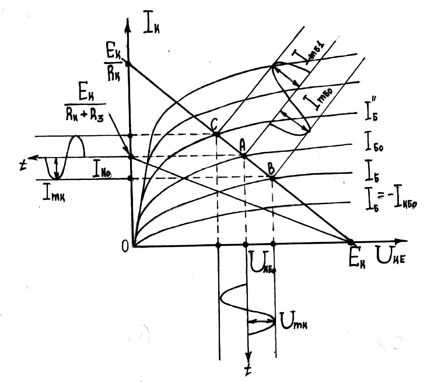 Суть графоаналітичного способу визначення параметрів режиму підсилення каскаду за навантажувальними характеристиками полягає в наступному (на прикладі каскаду зі спільним емітером).