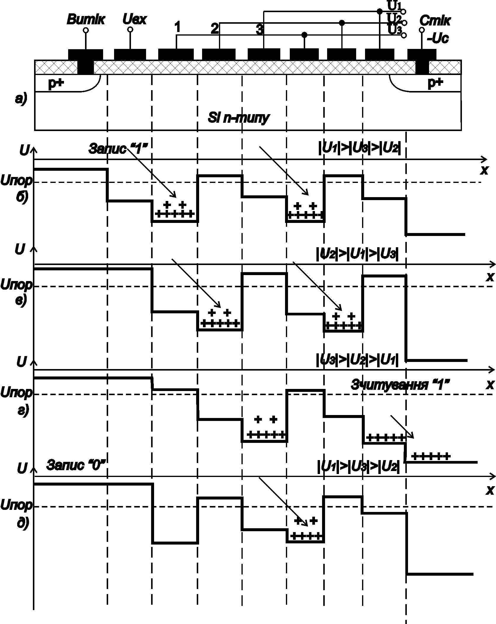 б) запис логічної одиниці за допомогою інжекції пакета дірок до потенціальної ями під першим затвором секції перенесення; в) перенесення пакета дірок до наступних потенціальних ям при зміні потенціалів на електродах затвора; г) зчитування логічної одиниці на виході приладу під час екстракції дірок з потенціальної ями в р+ - область стоку; д) запис логічного нуля за відсутності негативного потенціалу на електроді затвора