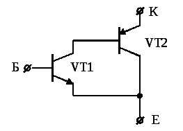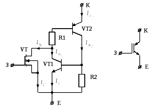 У другій половині 80-х років з'явилася ідея створення комбінованого силового біполярного транзистора з МОН - керуванням на вході, названого в закордонних публікаціях IGBT (Insulated Gate Bipolar Transistor), тобто БТІЗ - біполярний транзистор з ізольованим затвором. Прообразом БТІЗ є схема складеного транзистора на комплементарних біполярних транзисторах – схема Шиклаї (рис. 5.10). Тип провідності конструкції (рис. 5.10) у цілому визначається типом провідності VT1.