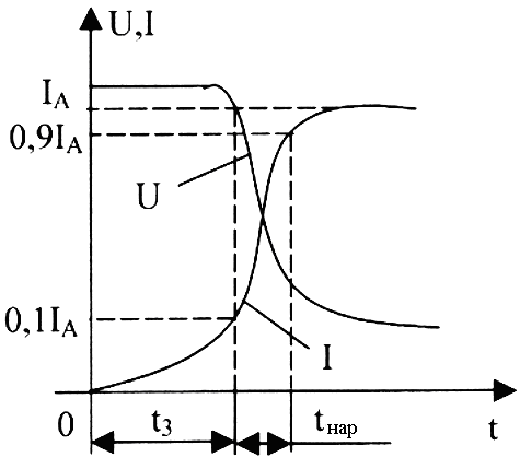 Час перемикання тиристора можна розбити на два інтервали, що відповідають різним законам зміни струму через тиристор (рис. 5.7).