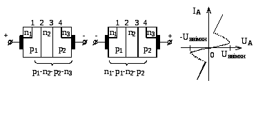 Таким чином, симістор може бути поданий у вигляді двох тиристорів, увімкнених паралельно і назустріч один одному. ВАХ симістора показана на рис. 5.6 в.