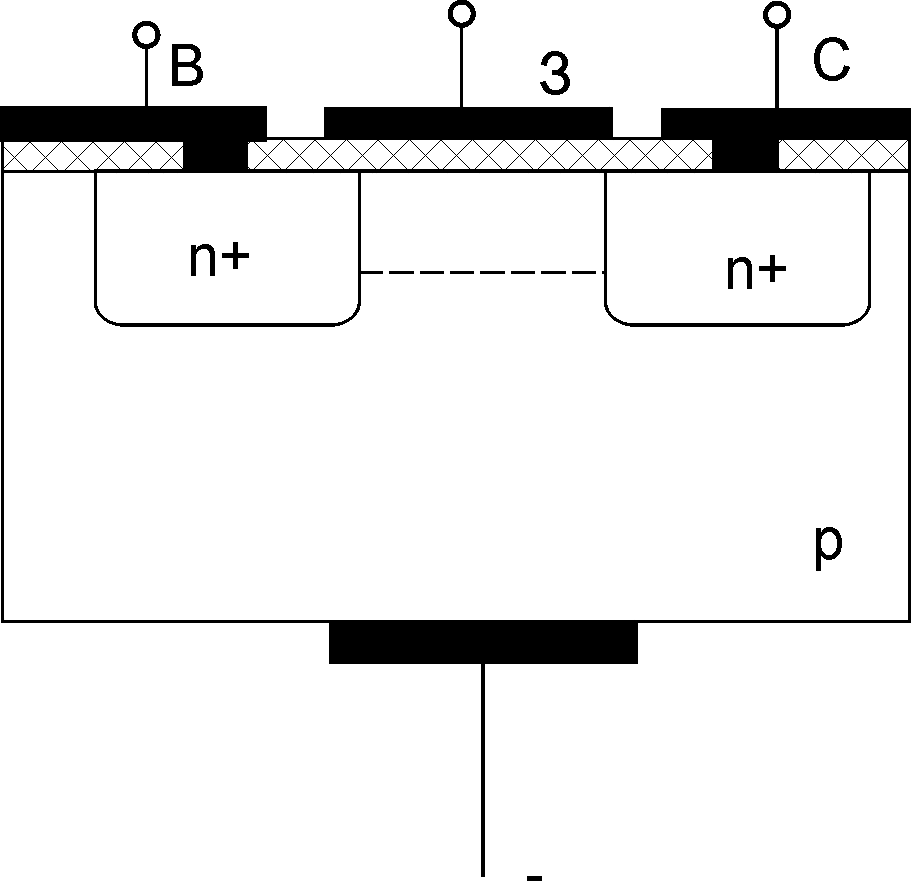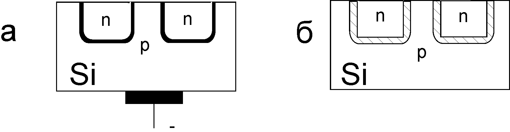 Інтегральні МДН - структури найчастіше виготовляються з індукованим каналом. З цією метою за планарно-дифузійною технологією створюються n+ – «кишені» витоку і стоку. На переходах між «кишенями» і підкладкою підтримується зворотна напруга, тобто здійснюється ізоляція (рис. 7.15).